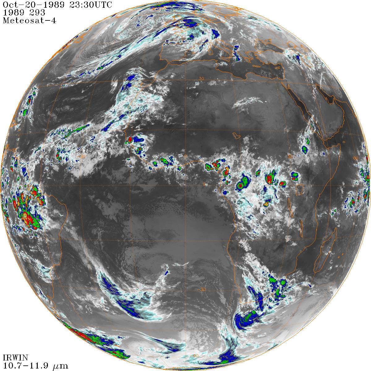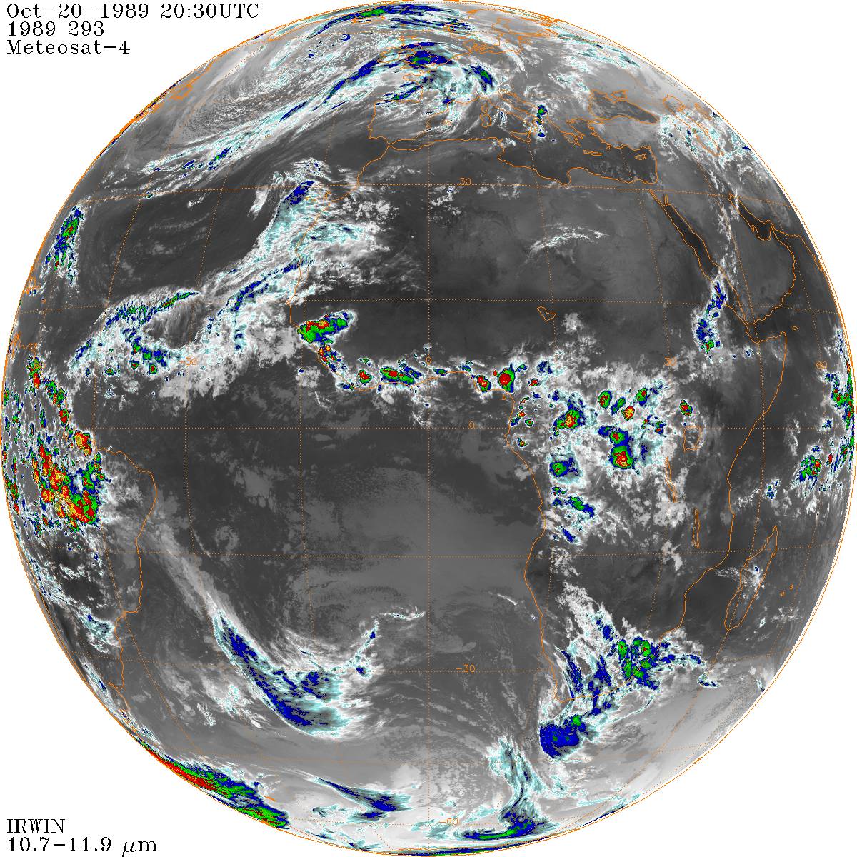 Das Wetter in DeutschlandSatellitenbilder (s.u.) zeigen, dass in der Nacht 20./21.10.1989 zunächst in der Nordhälfte Deutschlands klarer Himmel herrschte. Im Laufe der späteren Abends zogen aber auch dort von Südwesten her Wolken herein. Bewölkung über Mitteleuropa am 20.10.1989 um 19 und 22 Uhr MEZ sowie am 21.10.1989 um 01 MEZ.